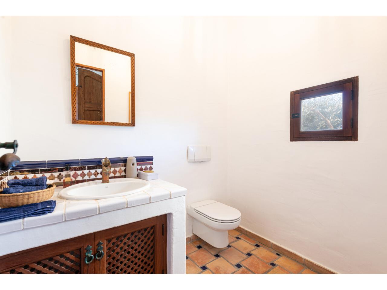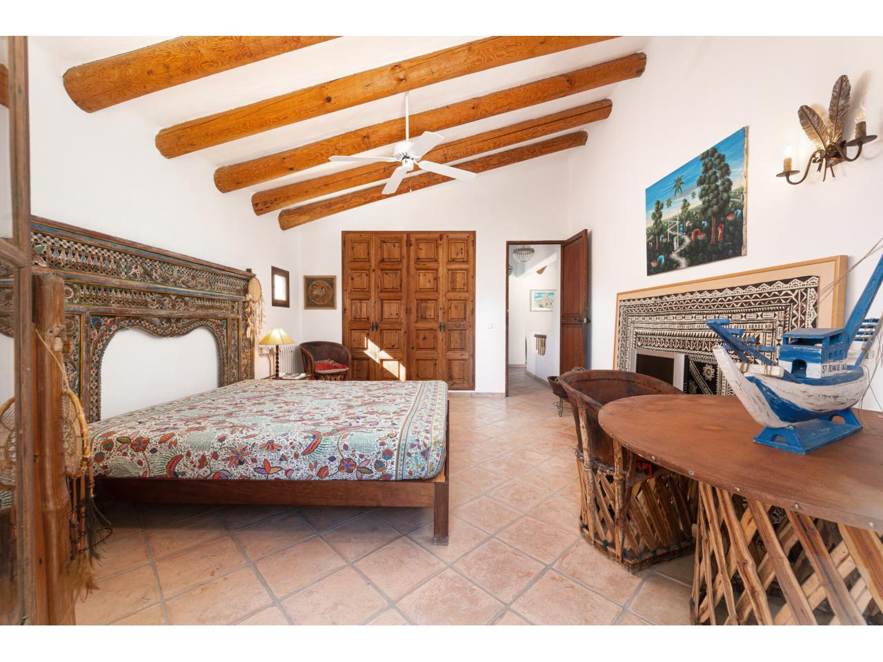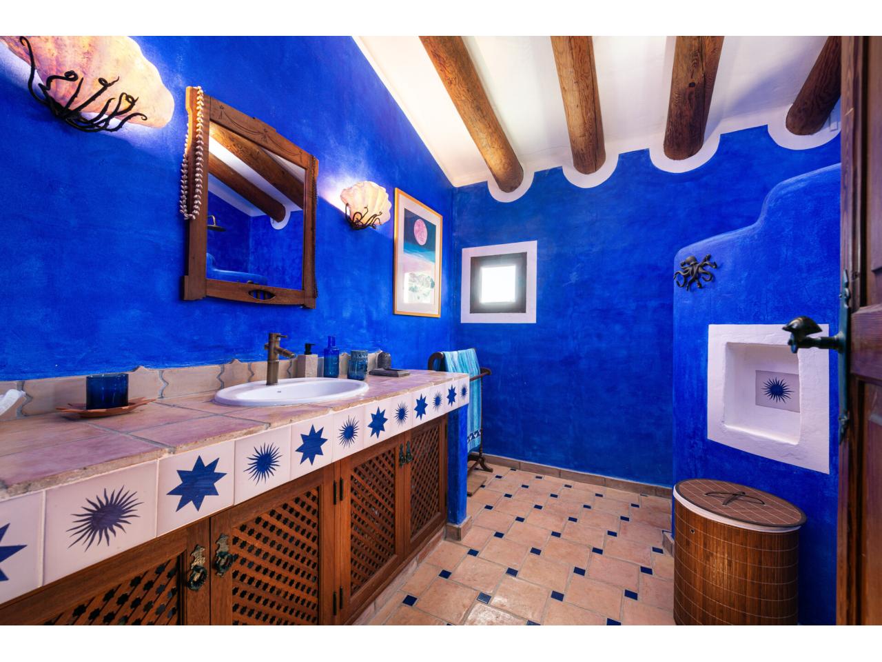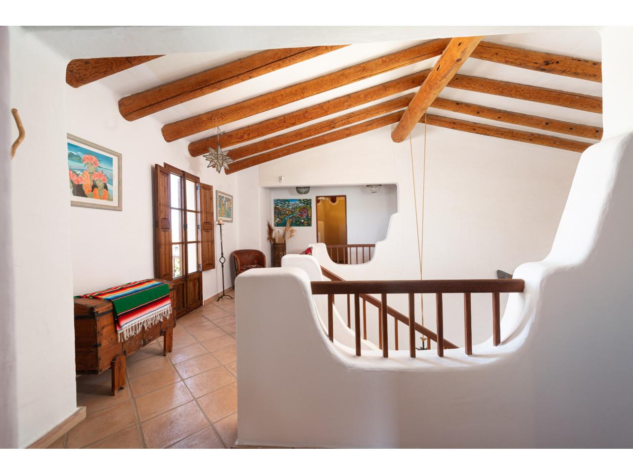 Una escalera de estilo mexicano pueblo, de diseño artístico, conduce a la planta superior. Allí, junto a una galería con porche y vistas abiertas desde arriba al salón-comedor, hay dos dormitorios de gran belleza con techos inclinados con vigas de madera y armarios empotrados.