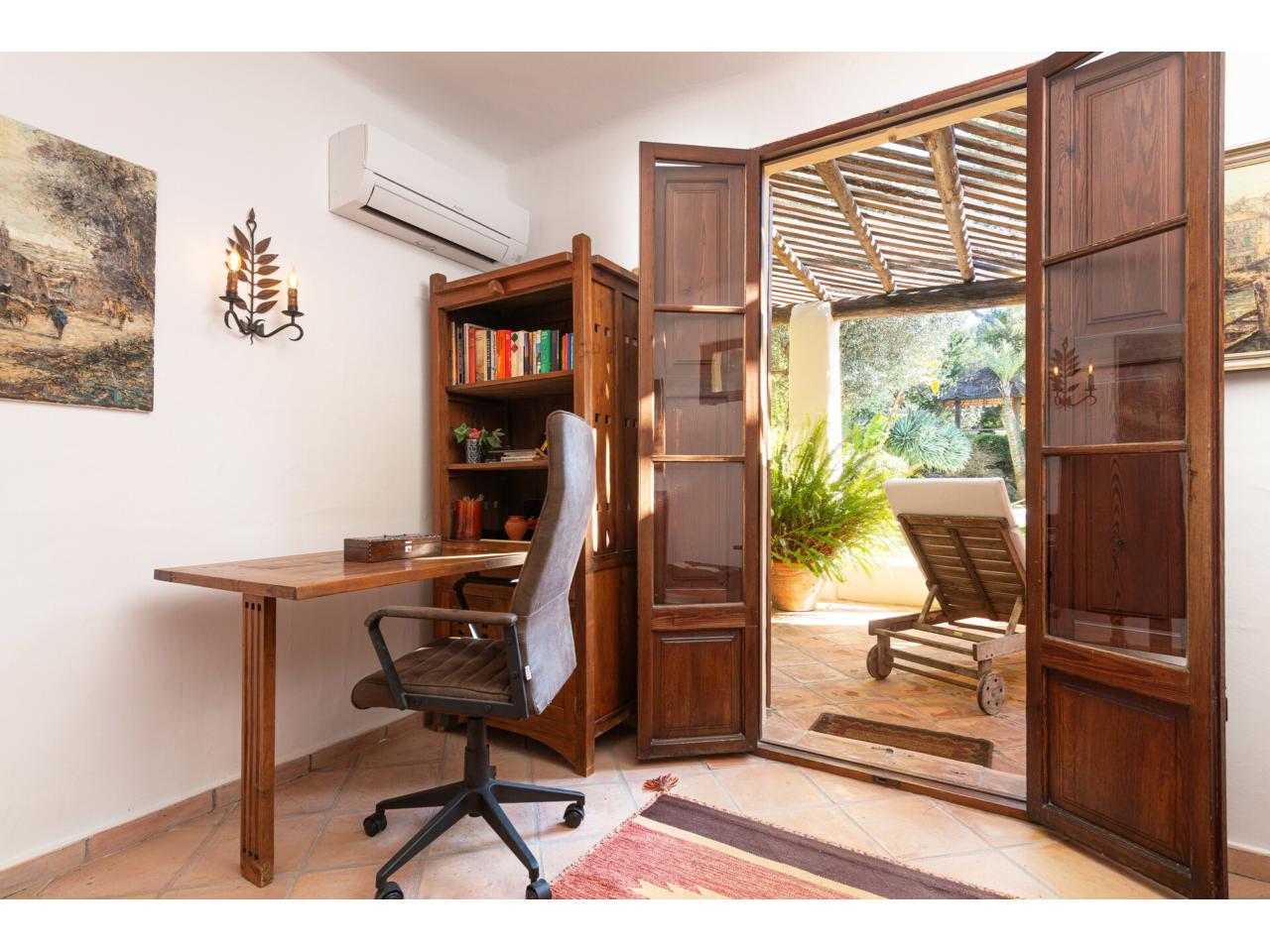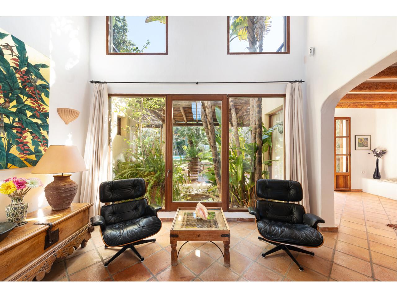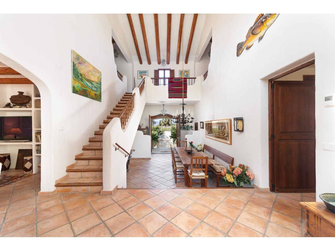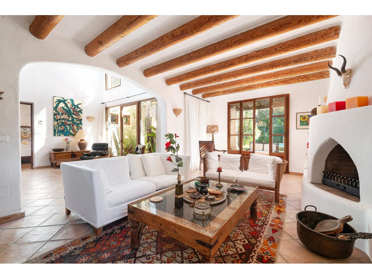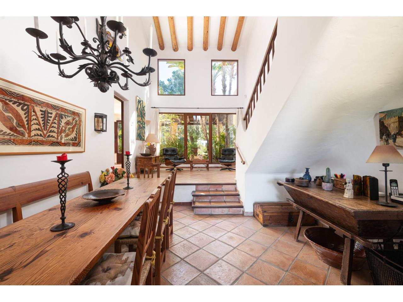 Esta casa de ensueño de estilo colonial mediterráneo, que se distribuye en dos amplias plantas, ofrece detalles de alta calidad, exclusivamente con materiales naturales, como puertas antiguas de madera de finca mallorquina, techos altos con vigas redondas de madera, grifería de latón, suelos de baldosas de terracota hechas a mano y una chimenea de estilo mexicano.