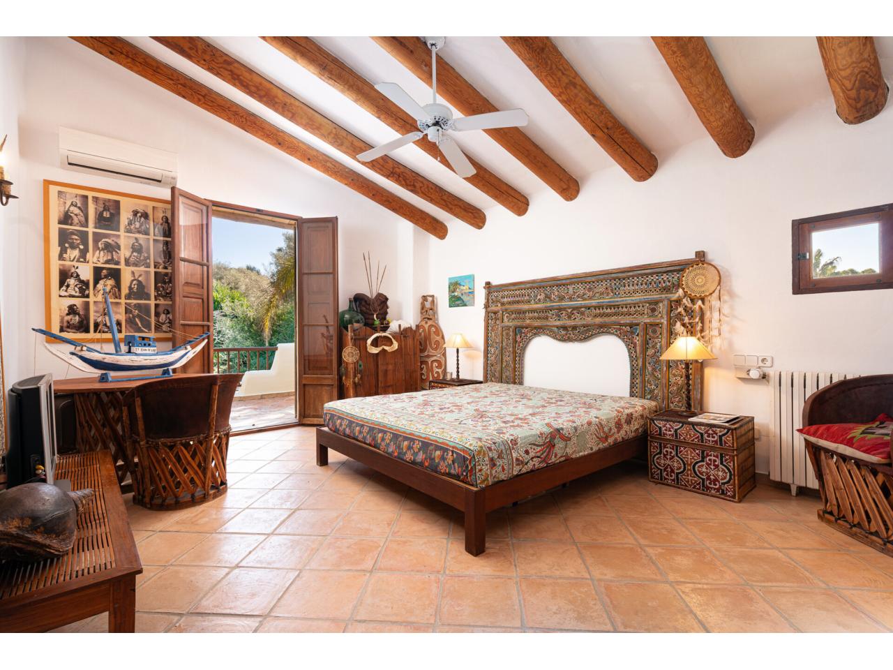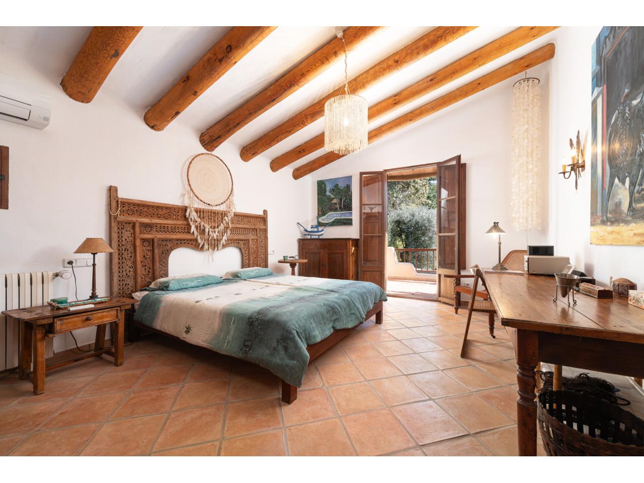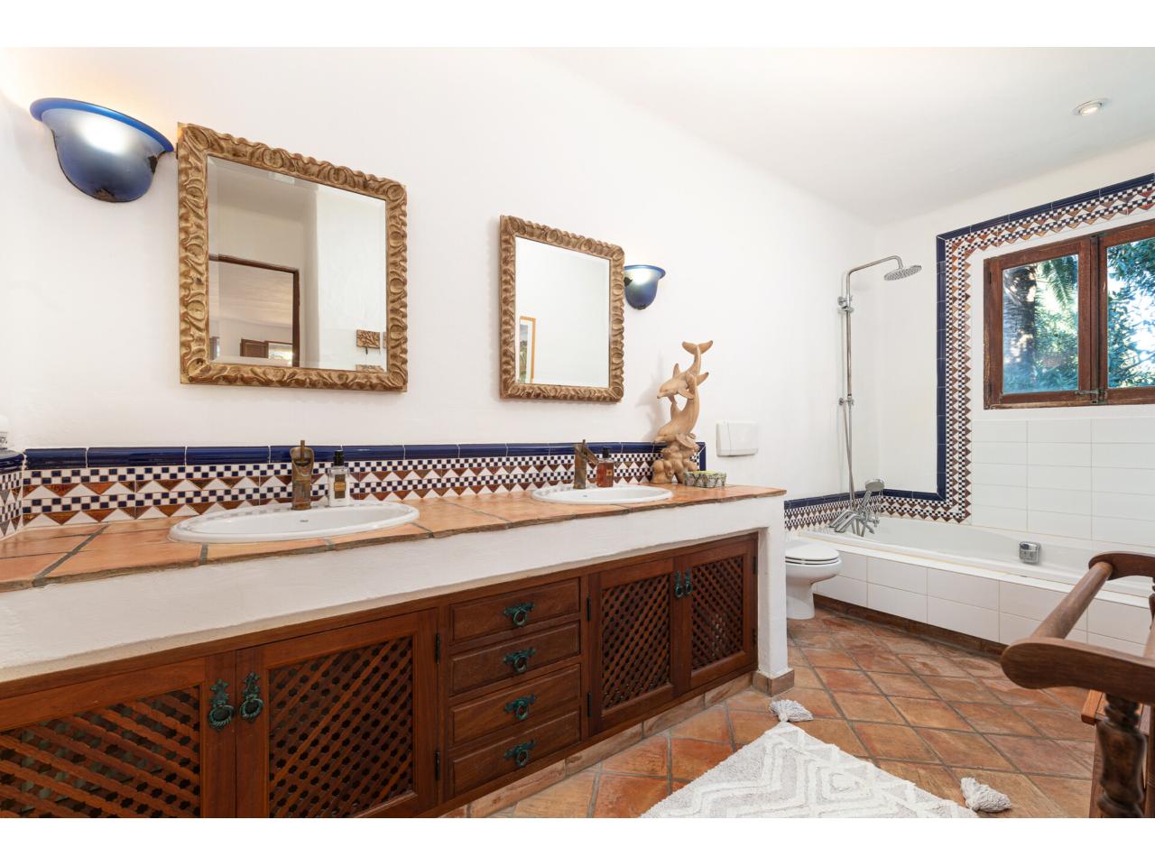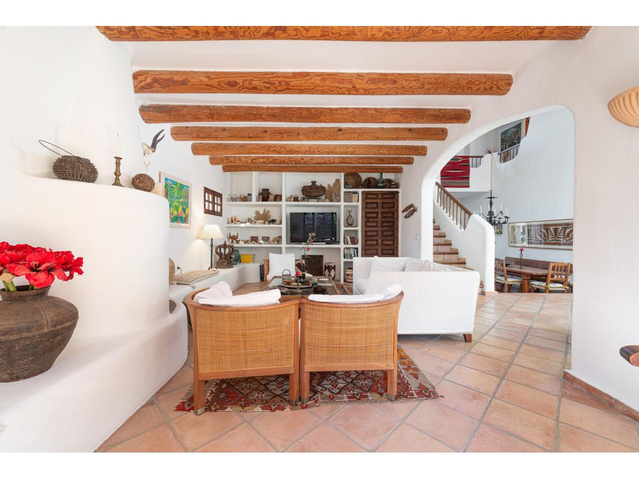 Esta casa de ensueño de estilo colonial mediterráneo, que se distribuye en dos amplias plantas, ofrece detalles de alta calidad, exclusivamente con materiales naturales, como puertas antiguas de madera de finca mallorquina, techos altos con vigas redondas de madera, grifería de latón, suelos de baldosas de terracota hechas a mano y una chimenea de estilo mexicano.