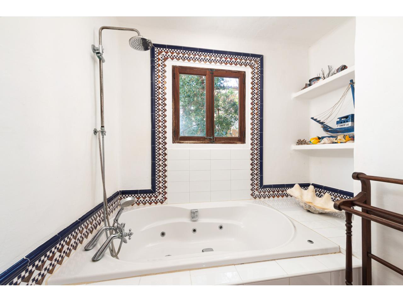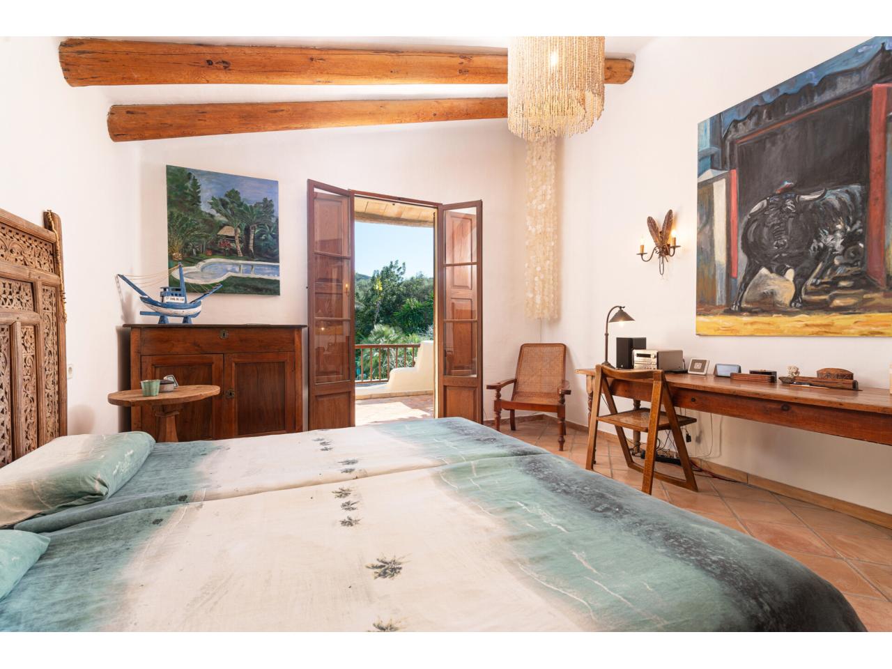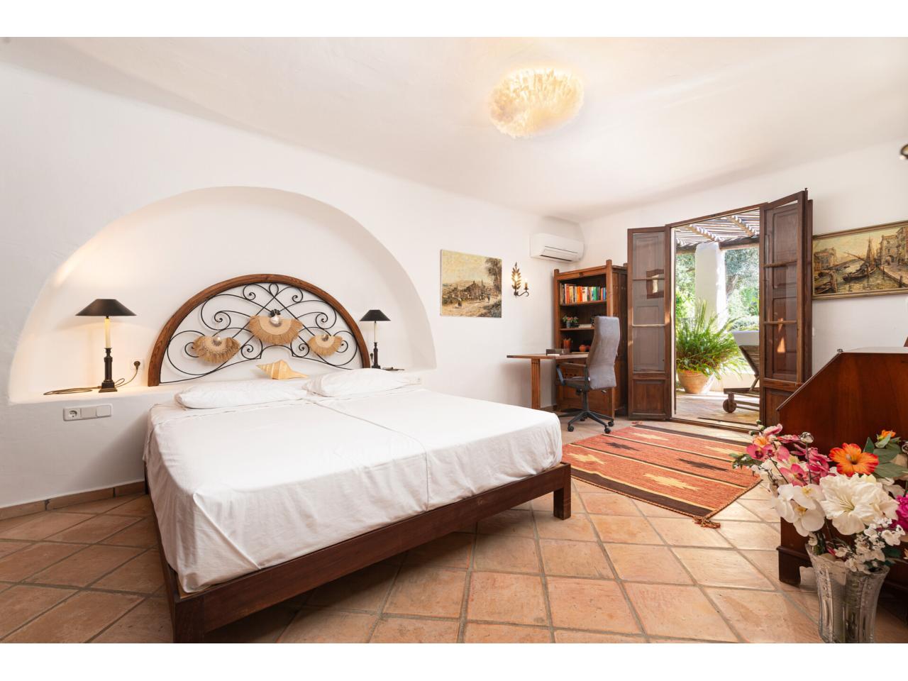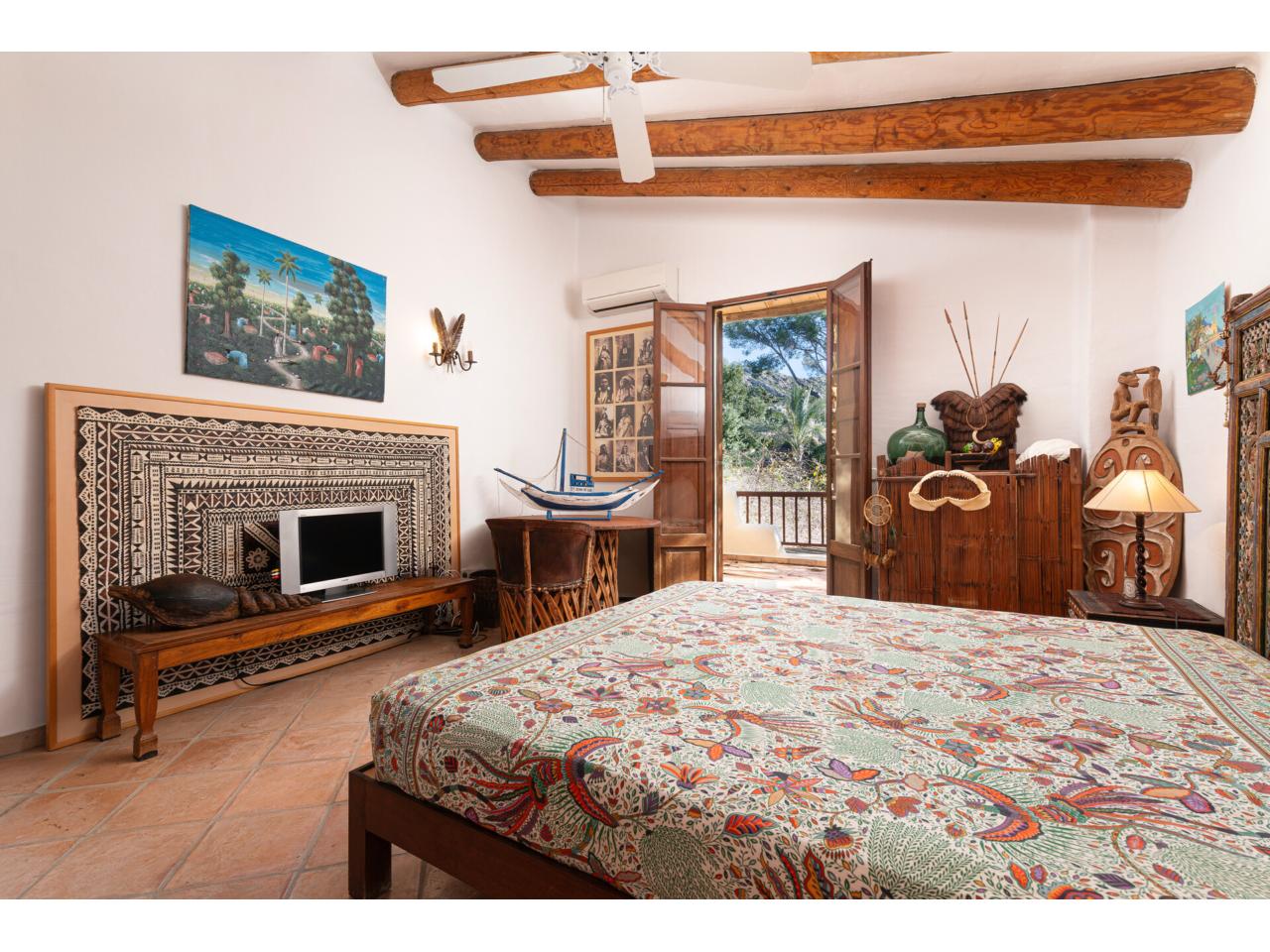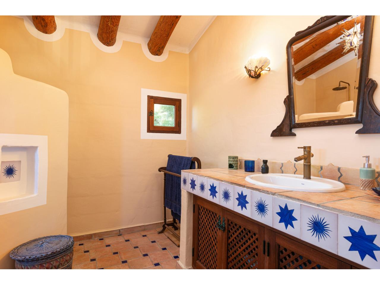 Esta casa de ensueño de estilo colonial mediterráneo, que se distribuye en dos amplias plantas, ofrece detalles de alta calidad, exclusivamente con materiales naturales, como puertas antiguas de madera de finca mallorquina, techos altos con vigas redondas de madera, grifería de latón, suelos de baldosas de terracota hechas a mano y una chimenea de estilo mexicano.