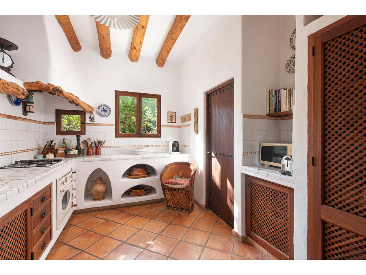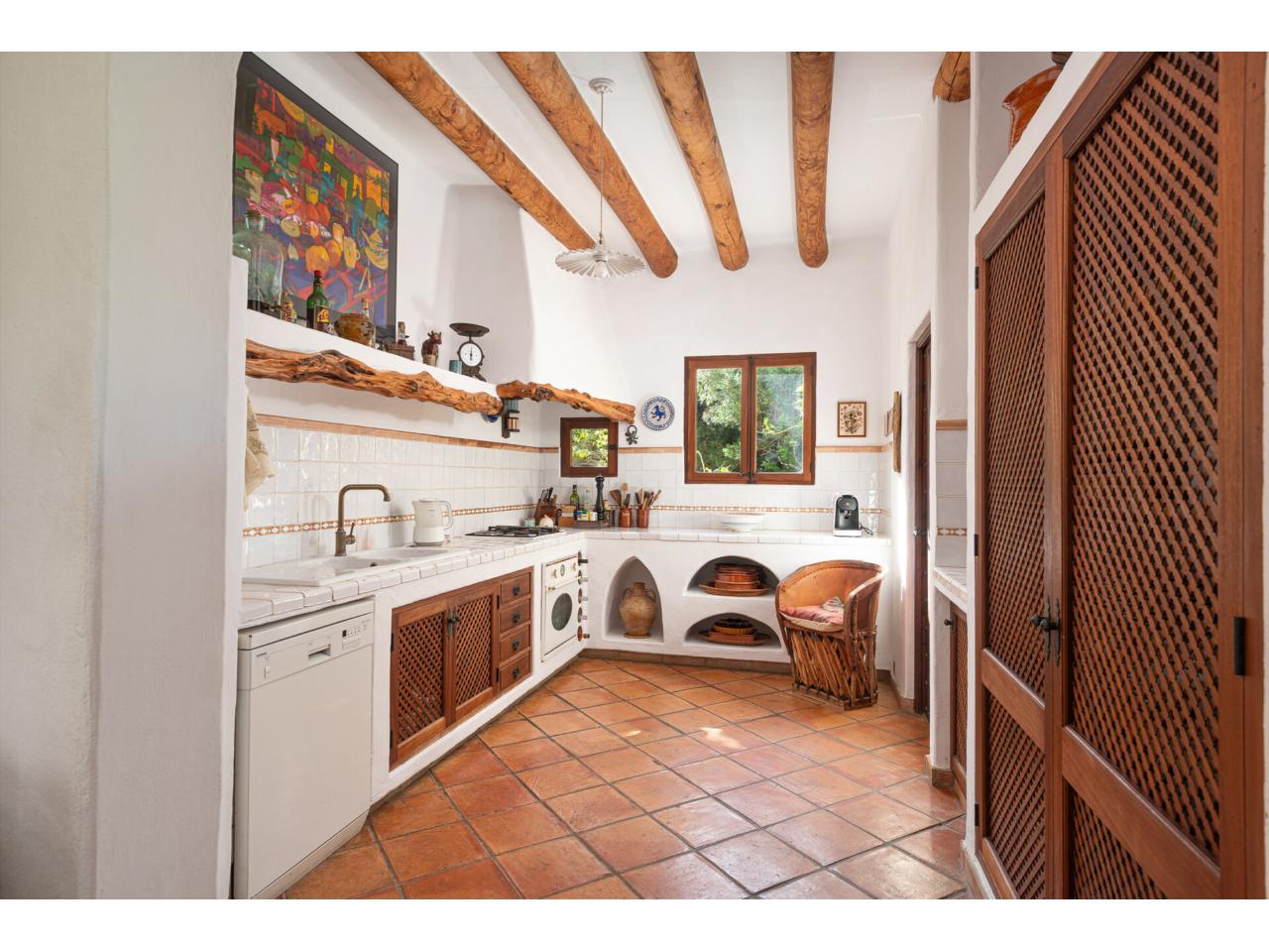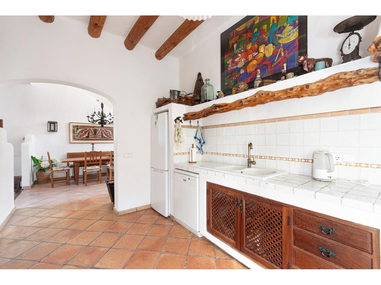 De vuelta al salón-comedor, junto a la gran y acogedora mesa de comedor, se encuentra la encantadora cocina mallorquina, semia abierta y delimitada por un bonito arco de medio punto.