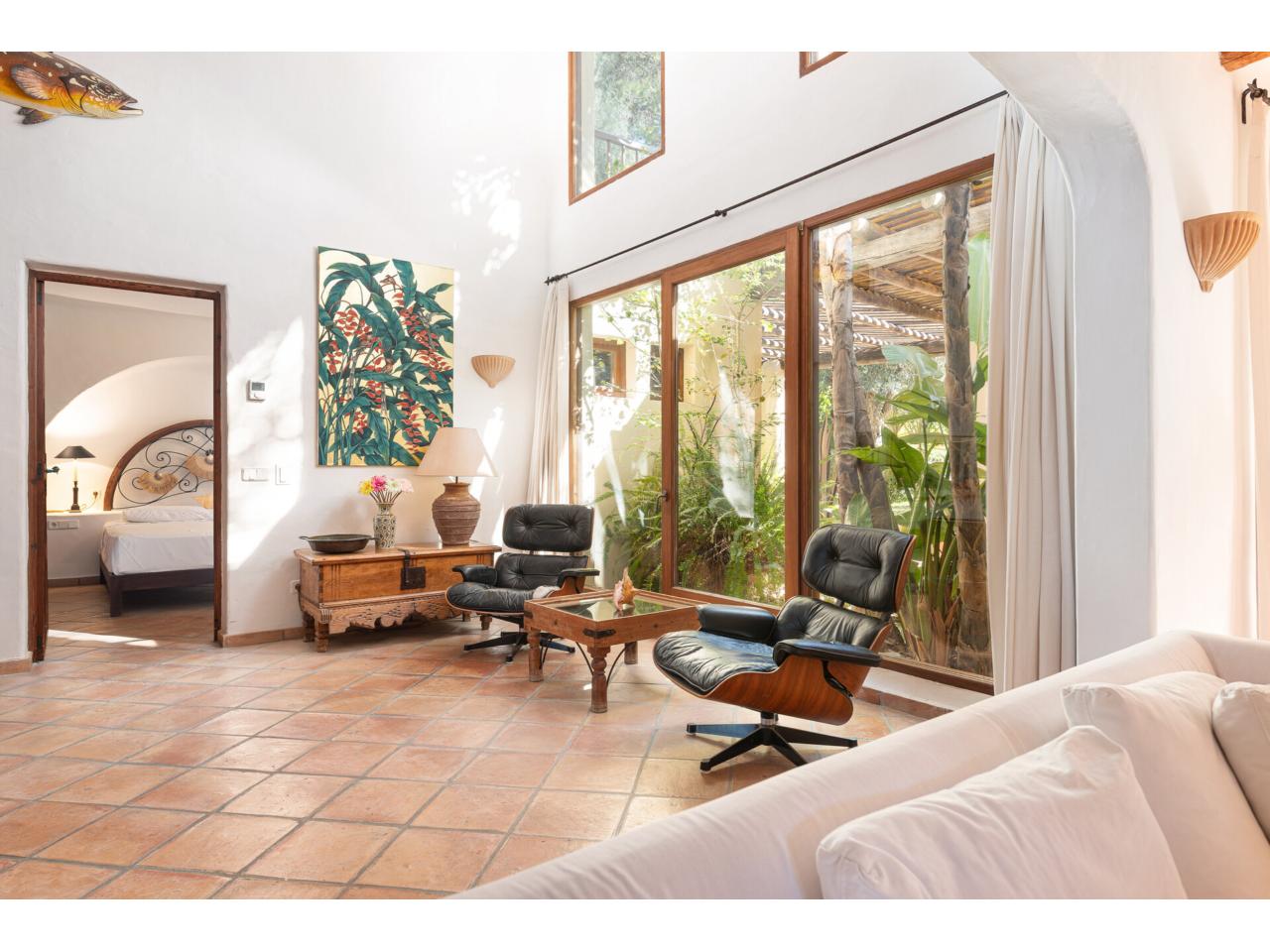 Desde la sala de estar se tiene acceso directo y vistas a la amplia terraza de terracota y al paradisíaco jardín con la gran piscina de forma natural, la caseta mediterránea de piedra para la tecnología de la piscina y la zona de ducha del jardín de bambú con ambiente tropical en un total de 1670 metros cuadrados de terreno.
