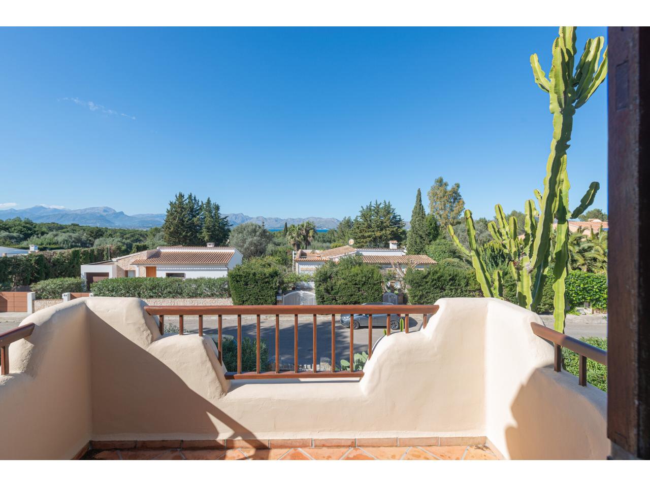 La tercera terraza elevada, situada al otro lado de la villa, en el centro de la galería-porche, ofrece vistas a la amplia bahía de Pollença con espectaculares puestas de sol.